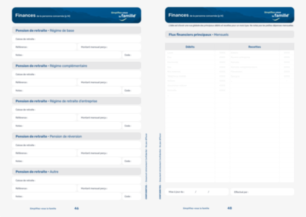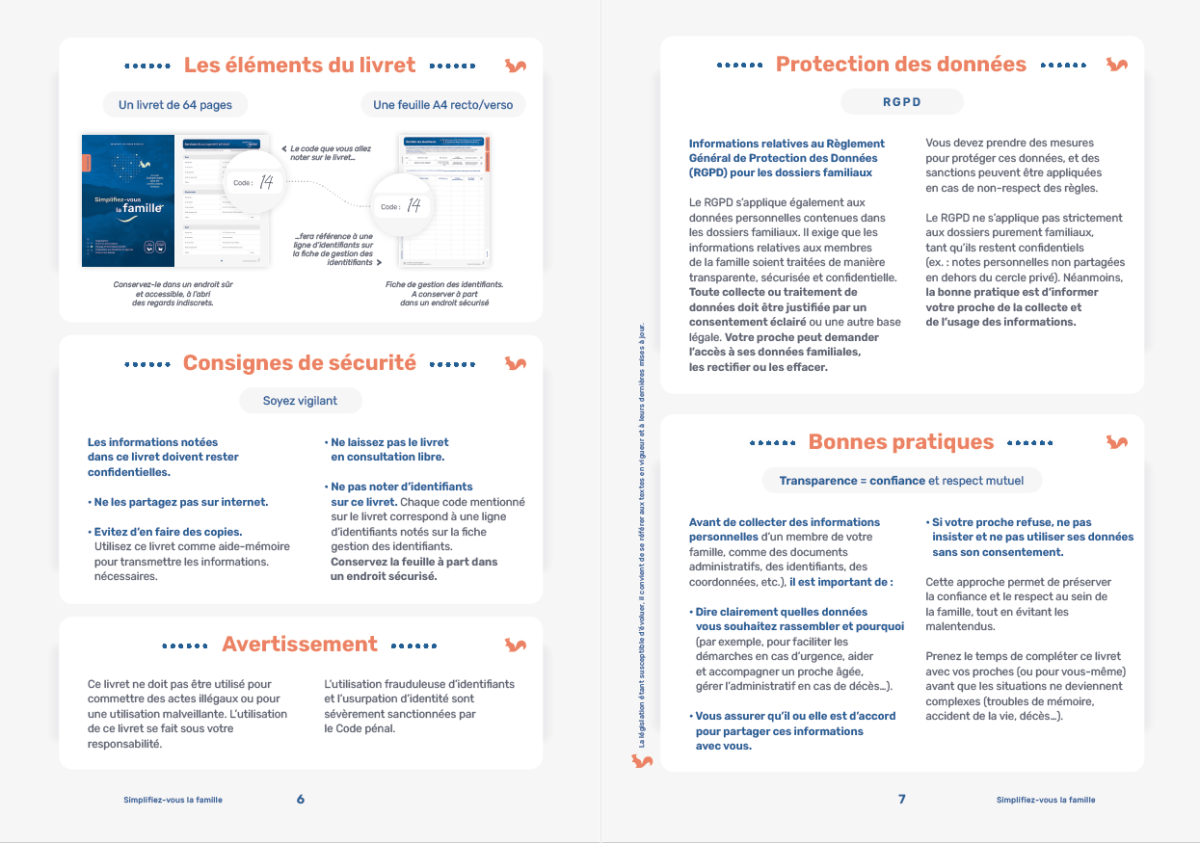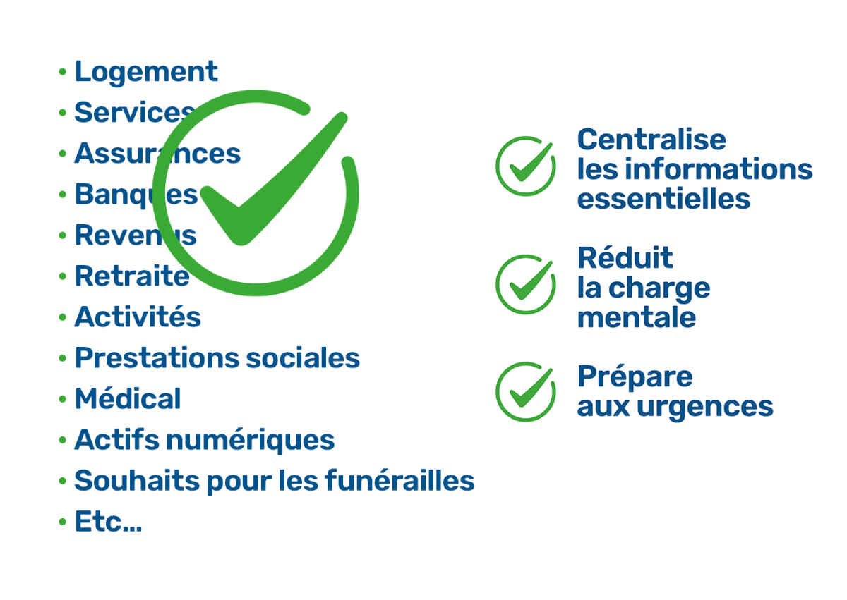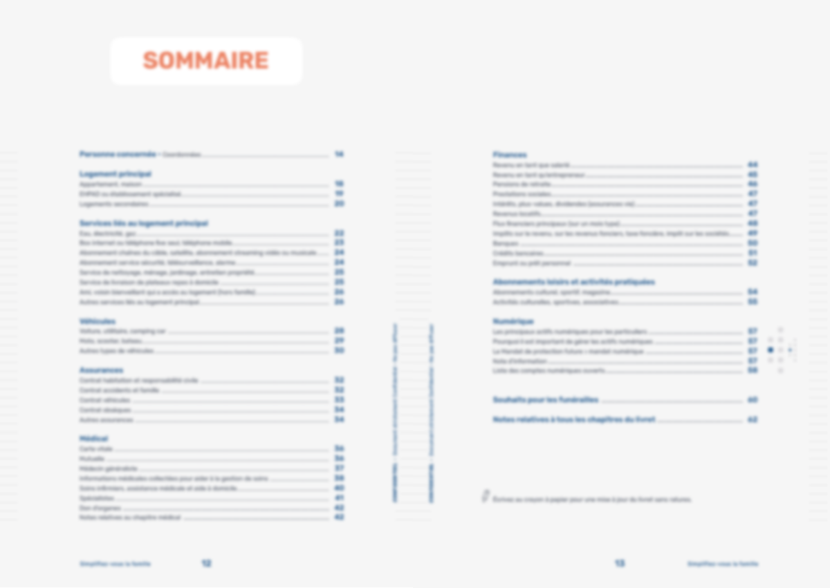 Ce livret est l'occasion de vous rapprocher de votre parent âgé par exemple. Après obtention de son consentement, vous pourrez compléter ensemble le livret. Ce qui crée des liens de confiance et vous assure une bonne continuité de la gestion administrative lorsque l'état de votre parent ne vous permettra plus de lui demander des informations précises (problématique de mémoire ou autres handicaps). - 48 rubriques incluses dans le livret