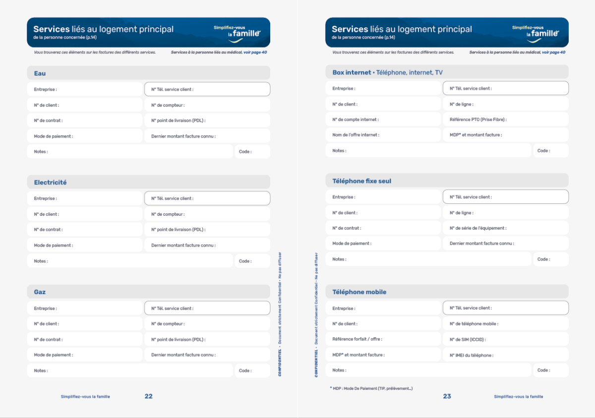 Pour les données qui nécessitent de noter des identifiants d'accès à des comptes clients ou à des réseaux sociaux par exemple, une fiche A4 est livrée avec le livret. Elle permet de noter les identifiants de façon codés (cette fiche est à conserver à part du livret). - Des informations collectées en toute transparence